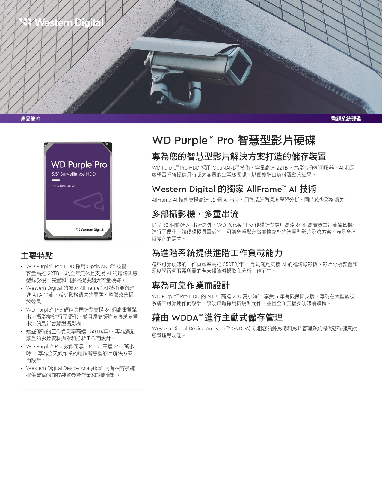 ●WD AllFrame™ AI 技術支援高達 32 個 AI 串流,用於系統內深度學習分析,同時減少影格遺失