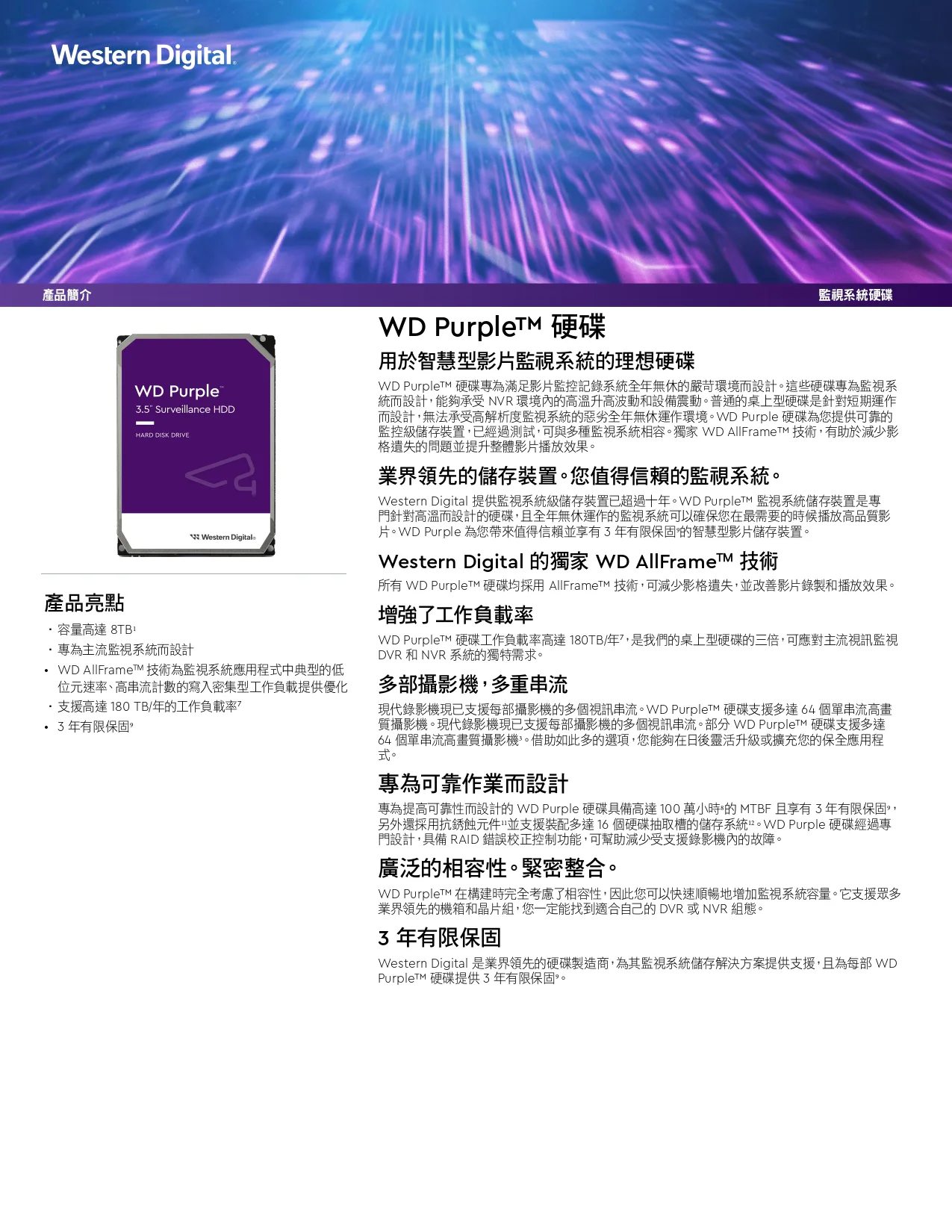 ●專為24×7全天候環境而打造 ●WD AllFrame™ 技術為監視系統應用程式中典型的低位元速率、高串流計數的寫入密集型工作負載提供優化 ●硬碟工作負載率高達 180TB/年 ●硬碟的 MTBF 高達 100 百萬小時 ●支援包含 8 個以上硬碟抽取槽 ●支援高達 64 個單串流高畫質攝影機 ●採用抗銹蝕元件 ●享有 3 年有限保固