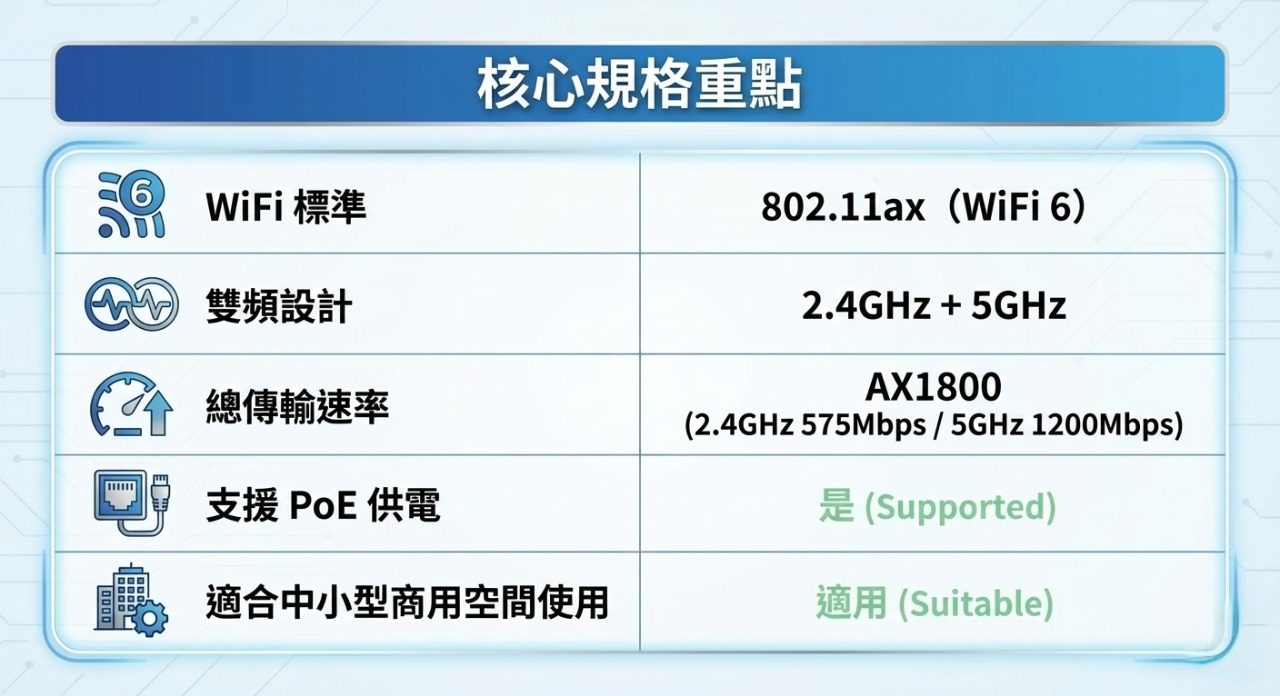 如果你正在尋找一款 價格合理、功能完整、適合中小企業的 WiFi 6 無線基地台,
